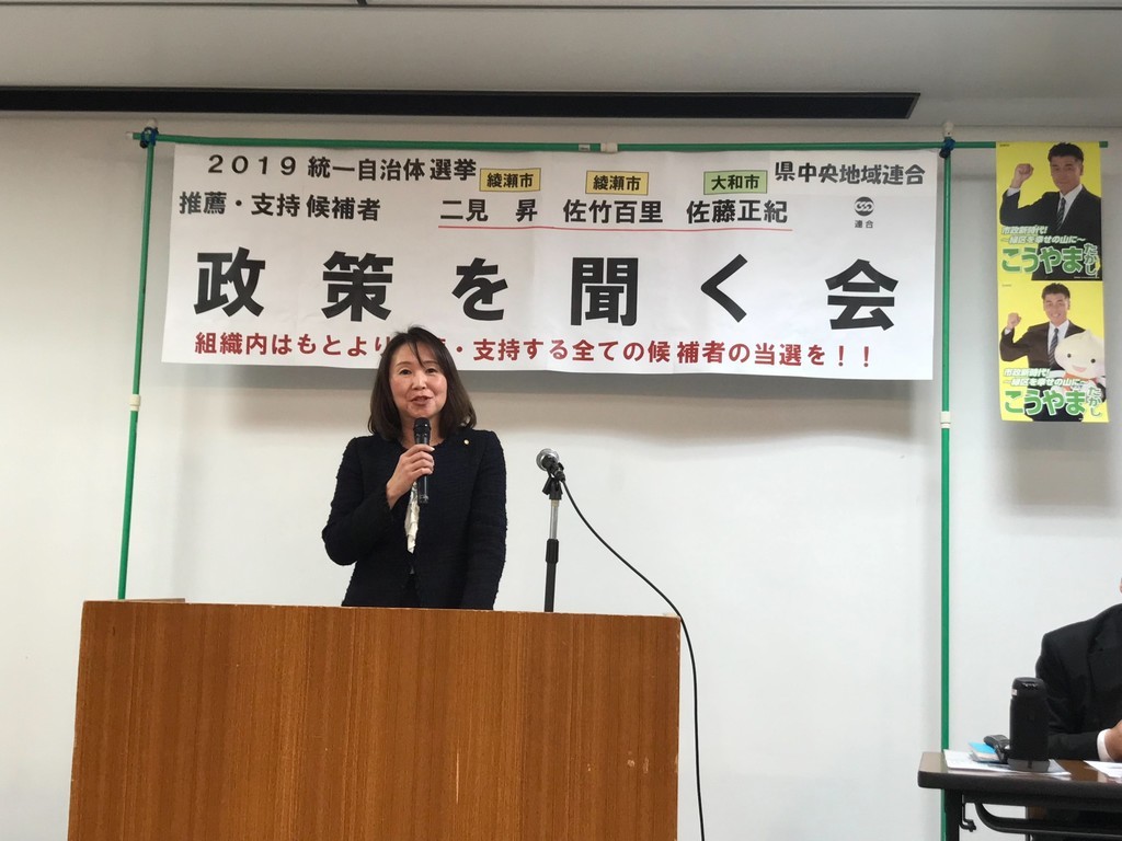 昨日、海老名の文化会館にて県中央地域連合の主催する2019年統一地方選挙に向けた取り組みとして、対象議員の政策を聞く会が開催されました。